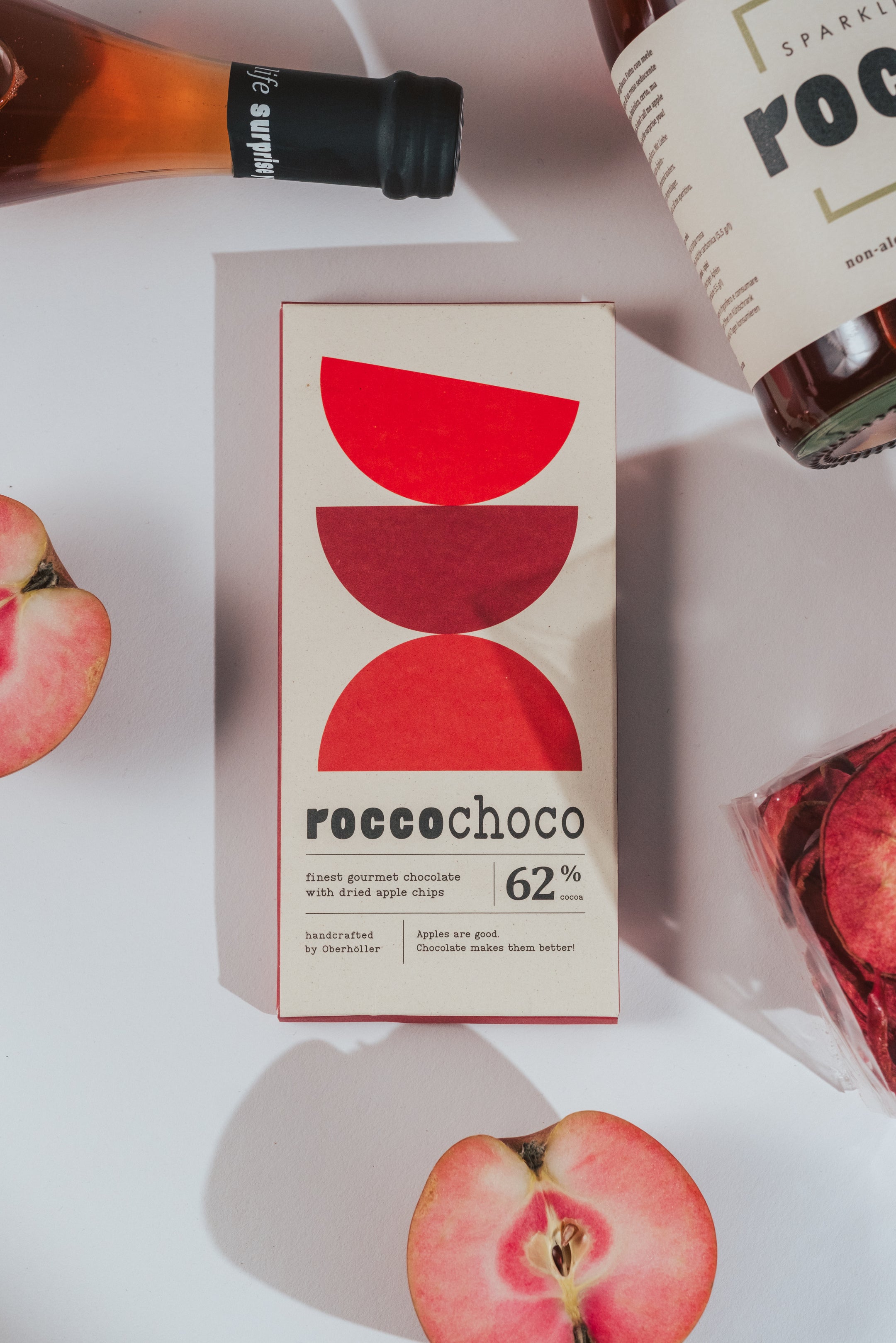 Knackige, säuerlich-rote Apfelscheiben aus dem Rocco-Apfel treffen auf edelste Zartbitterschokolade aus der Schokoladenmanufaktur Oberhöller!
