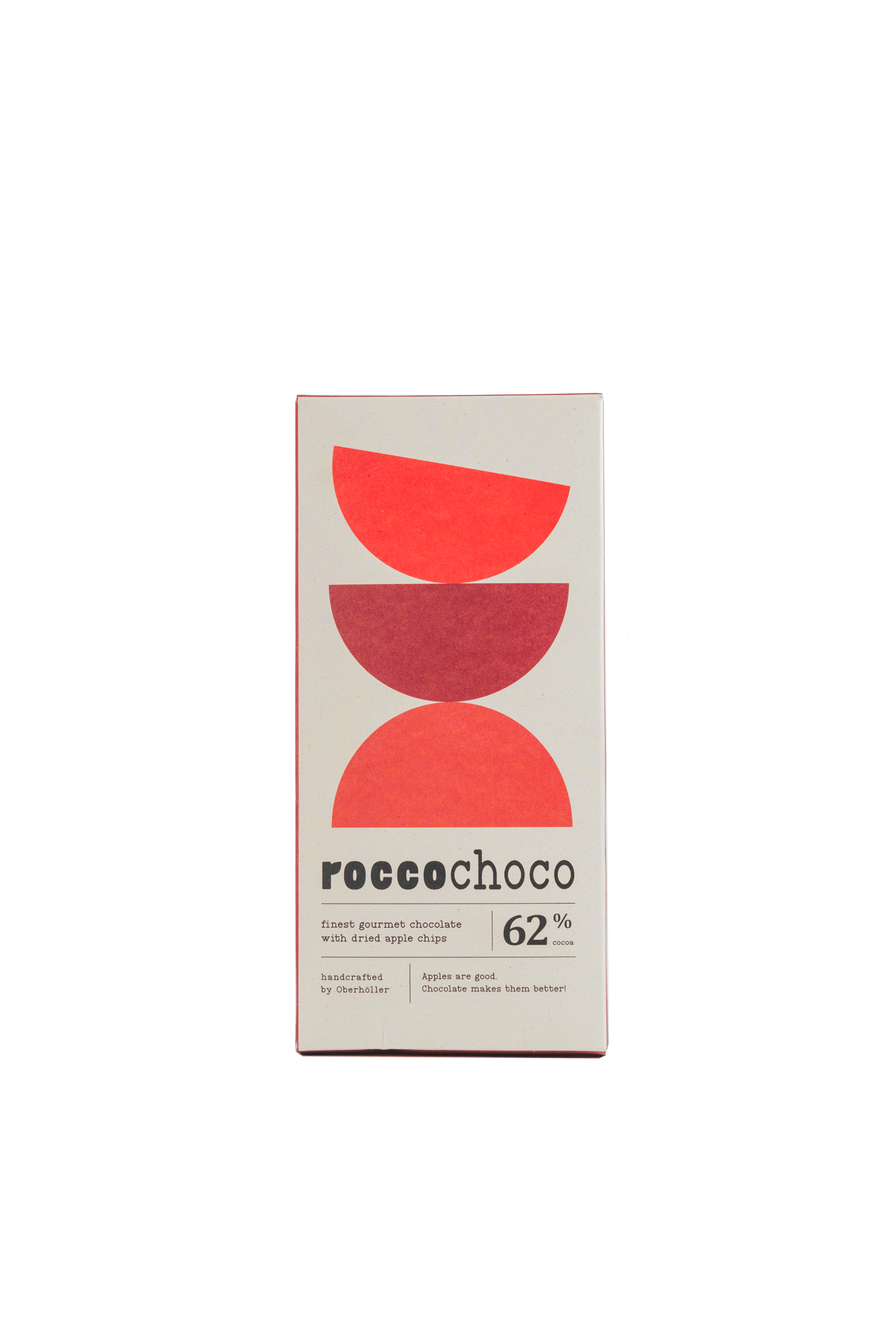 Knackige, säuerlich-rote Apfelscheiben aus dem Rocco-Apfel treffen auf edelste Zartbitterschokolade aus der Schokoladenmanufaktur Oberhöller!