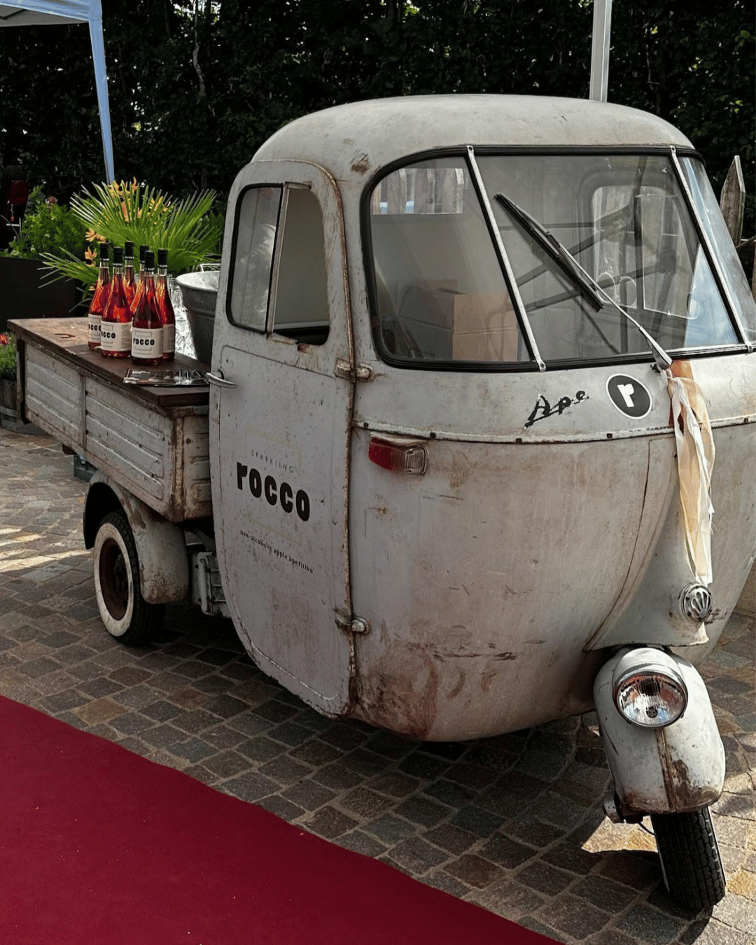 Inoltre abbiamo preparato per voi un pacchetto speciale: la nostra Ape AC4 decorata a festa, con 5 × Sparkling Rocco 200 ml e gelato premium Hoshizaki in omaggio, viene consegnata direttamente alla vostra location. Montaggio e smontaggio li gestiamo noi – perfetto per un brindisi di benvenuto rilassato e con stile.