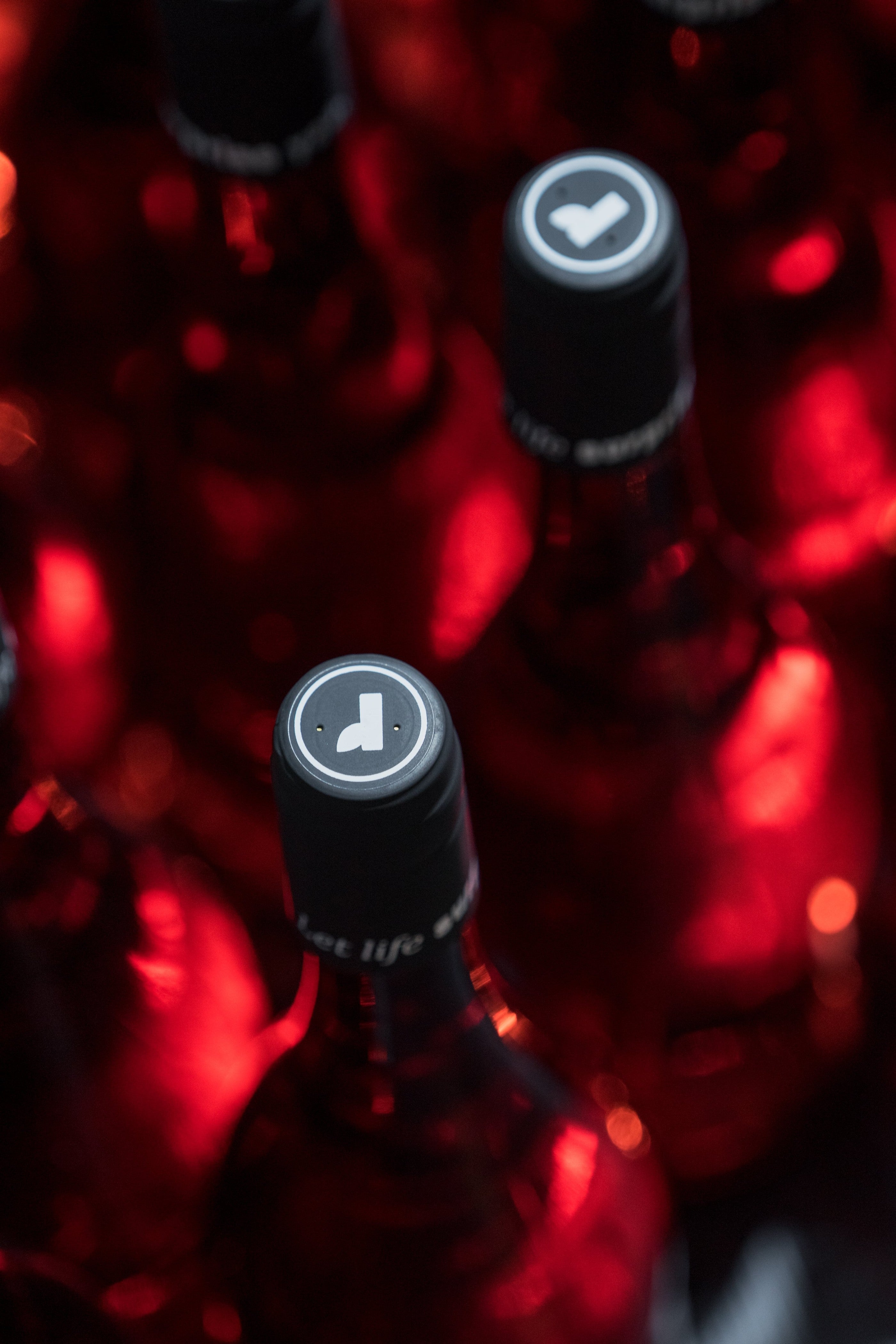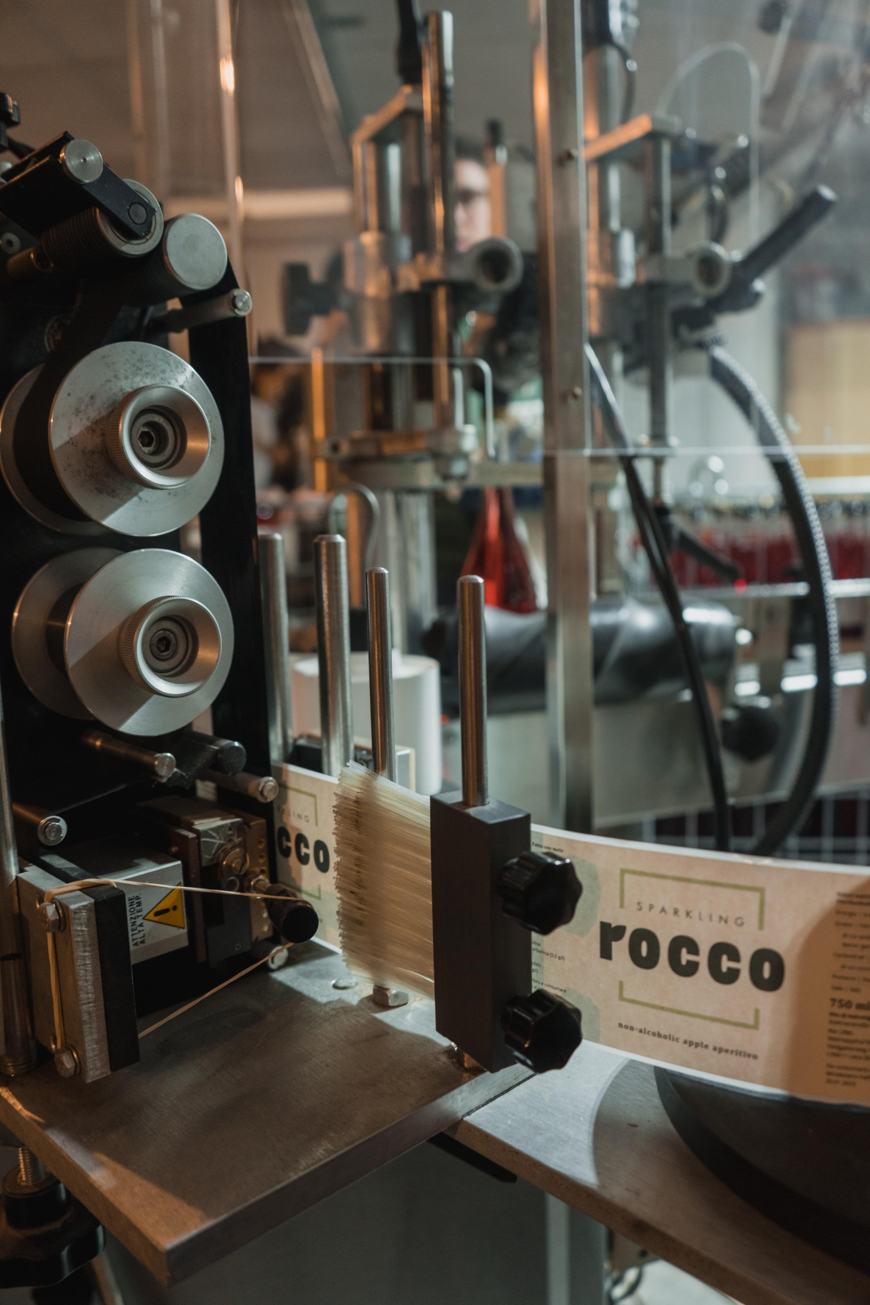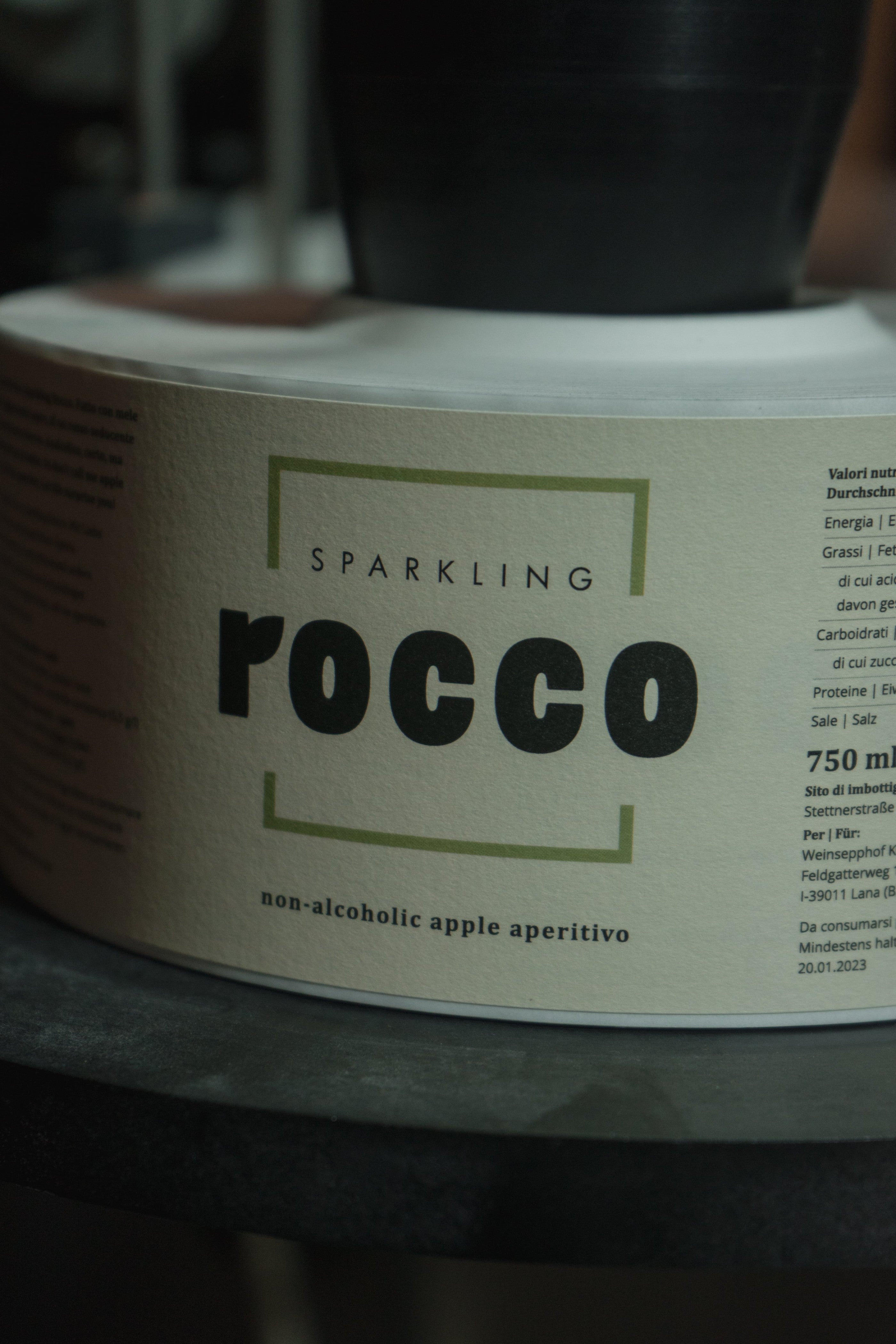 Nach der Pasteurisierung werden die Flaschen mit Kaltwasser abgeduscht, getrocknet und können nun etikettiert werden. Hier wird das Rocco Etikett aufgebracht und auch die Schrumpfkapsel.