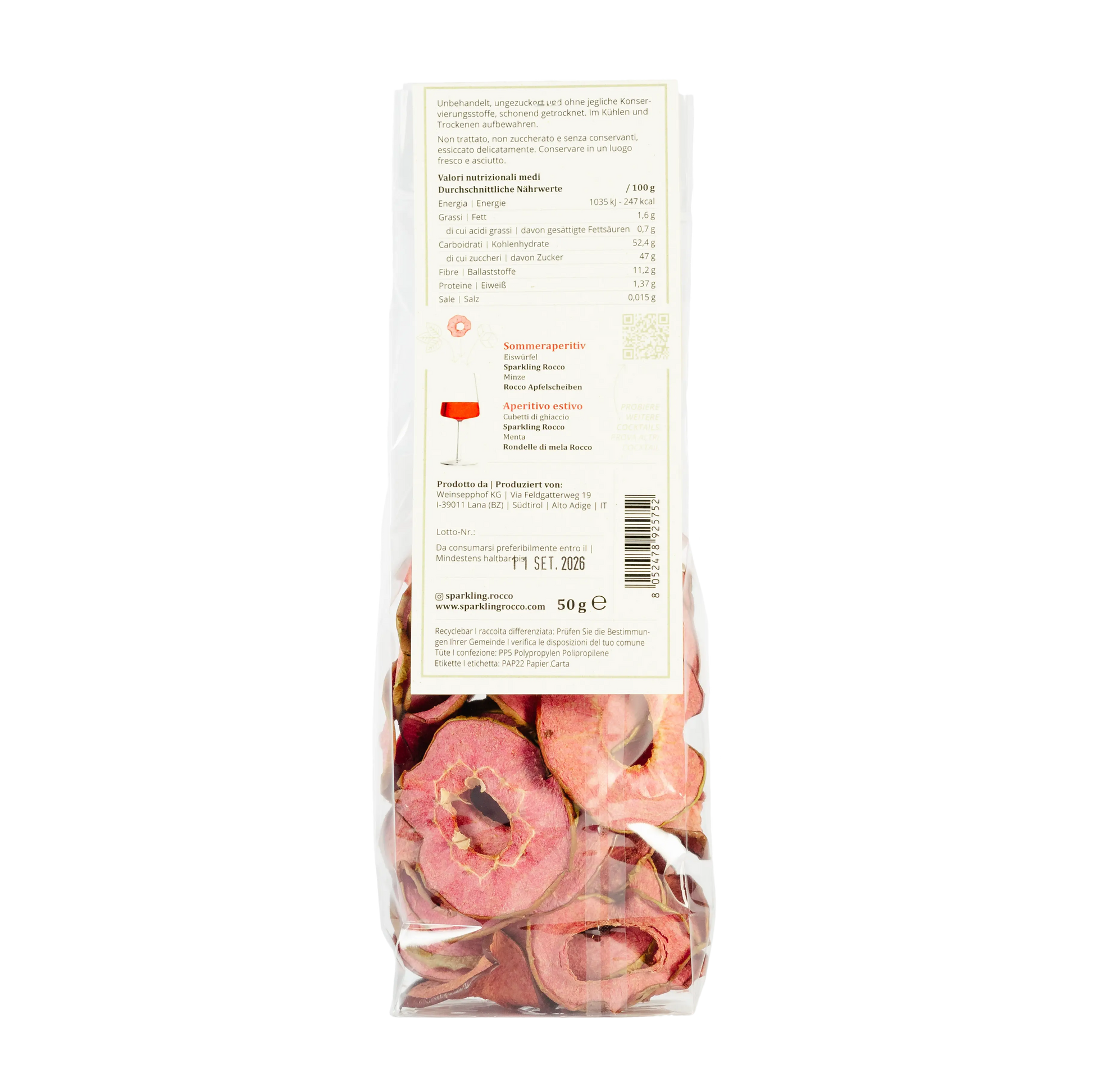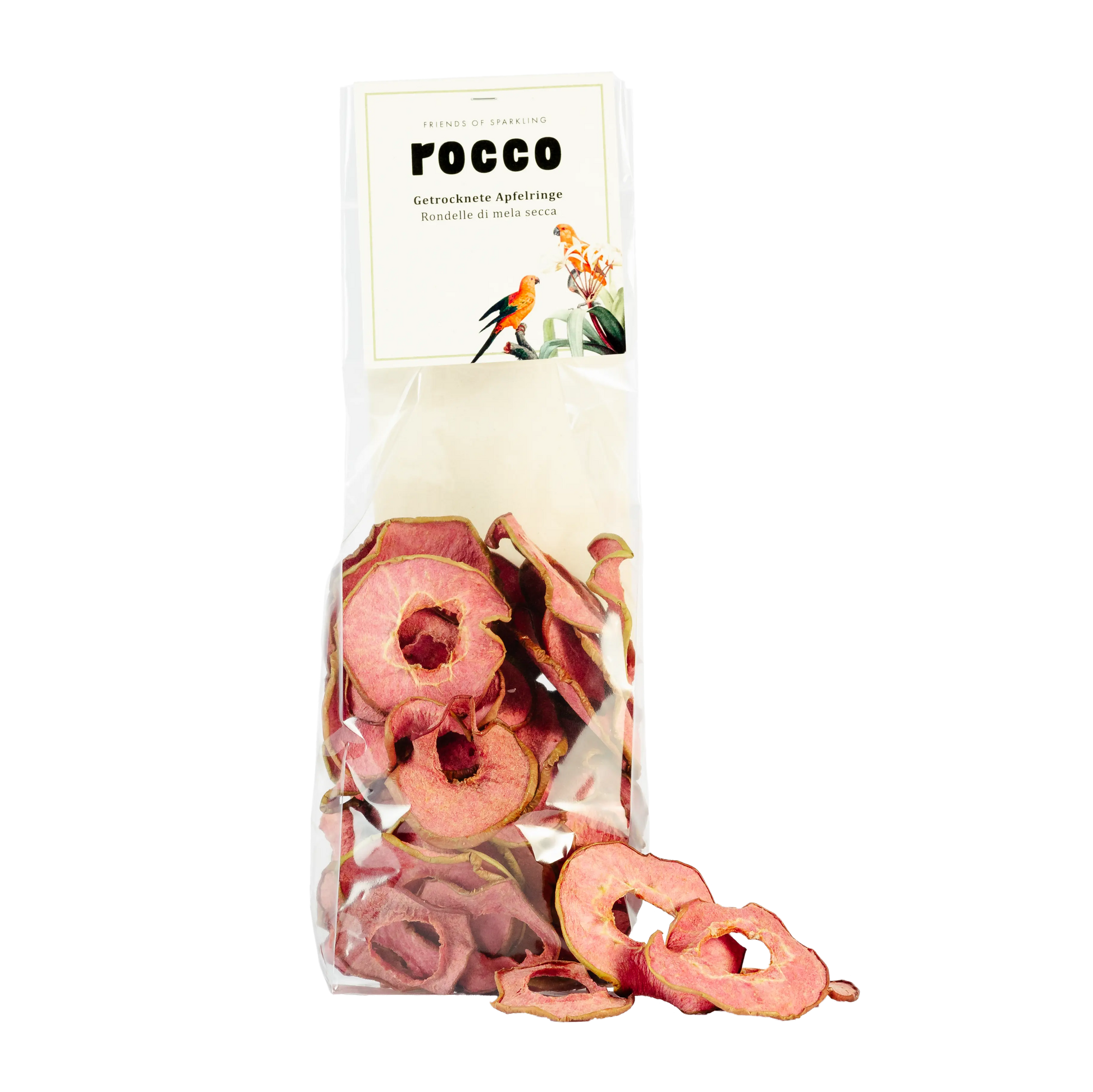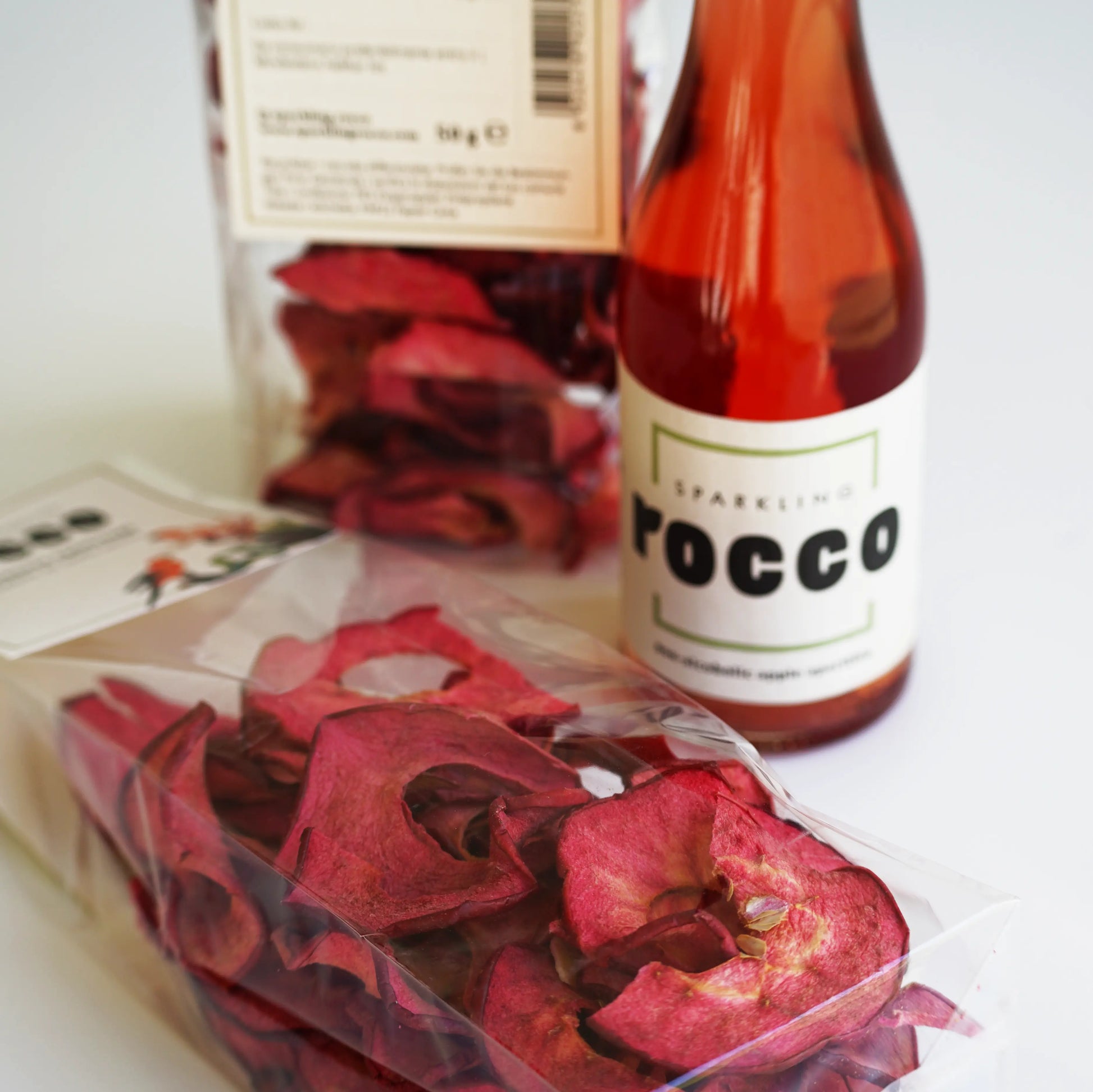 Unsere roten Apfelchips sind die perfekte Garnitur für Sparkling Rocco oder Rocco-Cocktails: Sie verleihen jedem Drink einen Hauch von Eleganz, bringen fruchtige Noten hervor und sorgen mit ihrer knusprigen Textur für das gewisse Extra – ein echter Hingucker und Geschmackserlebnis!